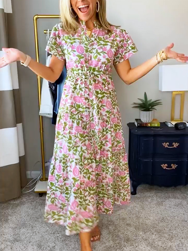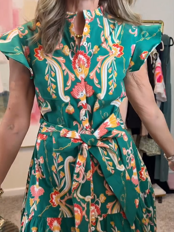 NEW🔥 Ruffle Button Tie Waist Printed Dress- Tax Free$39.95 USD$79.80 USD