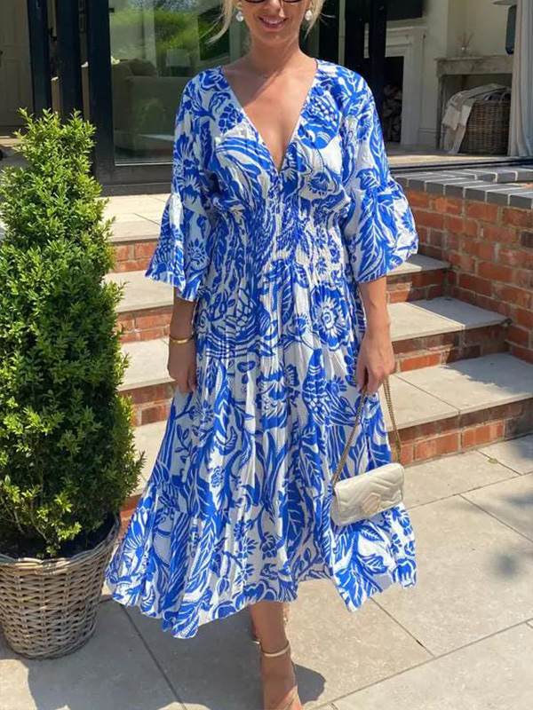 NEW🔥 V Neck Elastic Waist Printed Dress$38.99 USD$77.90 USD