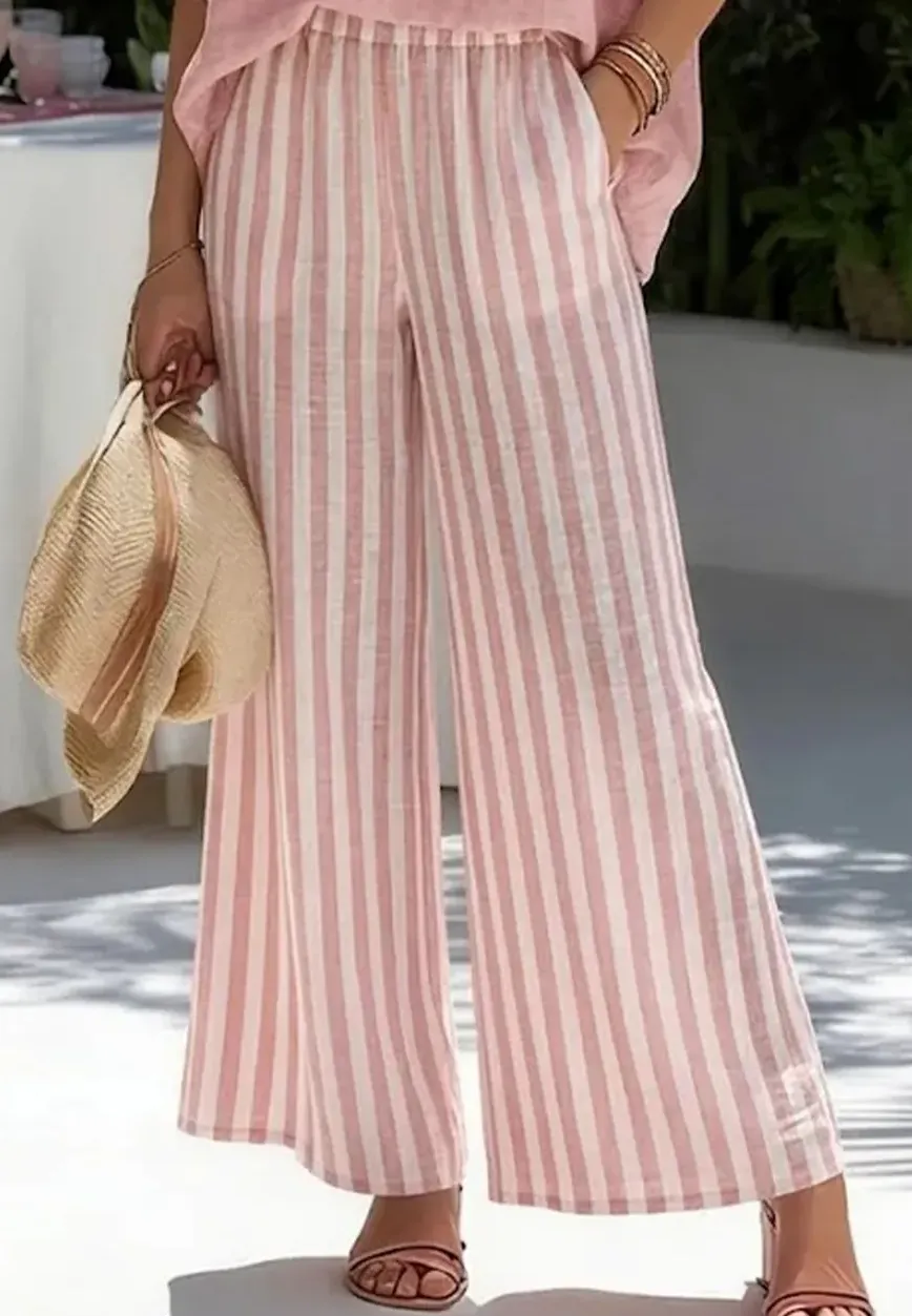 This loosely tailored set features a V-neck top with mid-length sleeves, accented by contrasting piping details, paired with matching wide-leg trousers in a vertical stripe pattern. The ensemble presents a relaxed, effortless silhouette that exudes a casual, laid-back vibe; the trousers are also equipped with pockets. Offering a breathable and comfortable wearing experience, the set simultaneously radiates a languid, resort-style aesthetic. Crafted from a breathable, skin-friendly cotton-linen blend, the fabric feels cool and lightweight against the skin, ensuring you never feel restricted. Its excellent drape and fresh pink-and-white color palette infuse the design with a sense of ease and a distinct vacation atmosphere. Whether you are planning a seaside getaway, heading out for brunch, or simply looking to enjoy a relaxing day, this casual set effortlessly creates a look that is both elegant and fashionably chic.