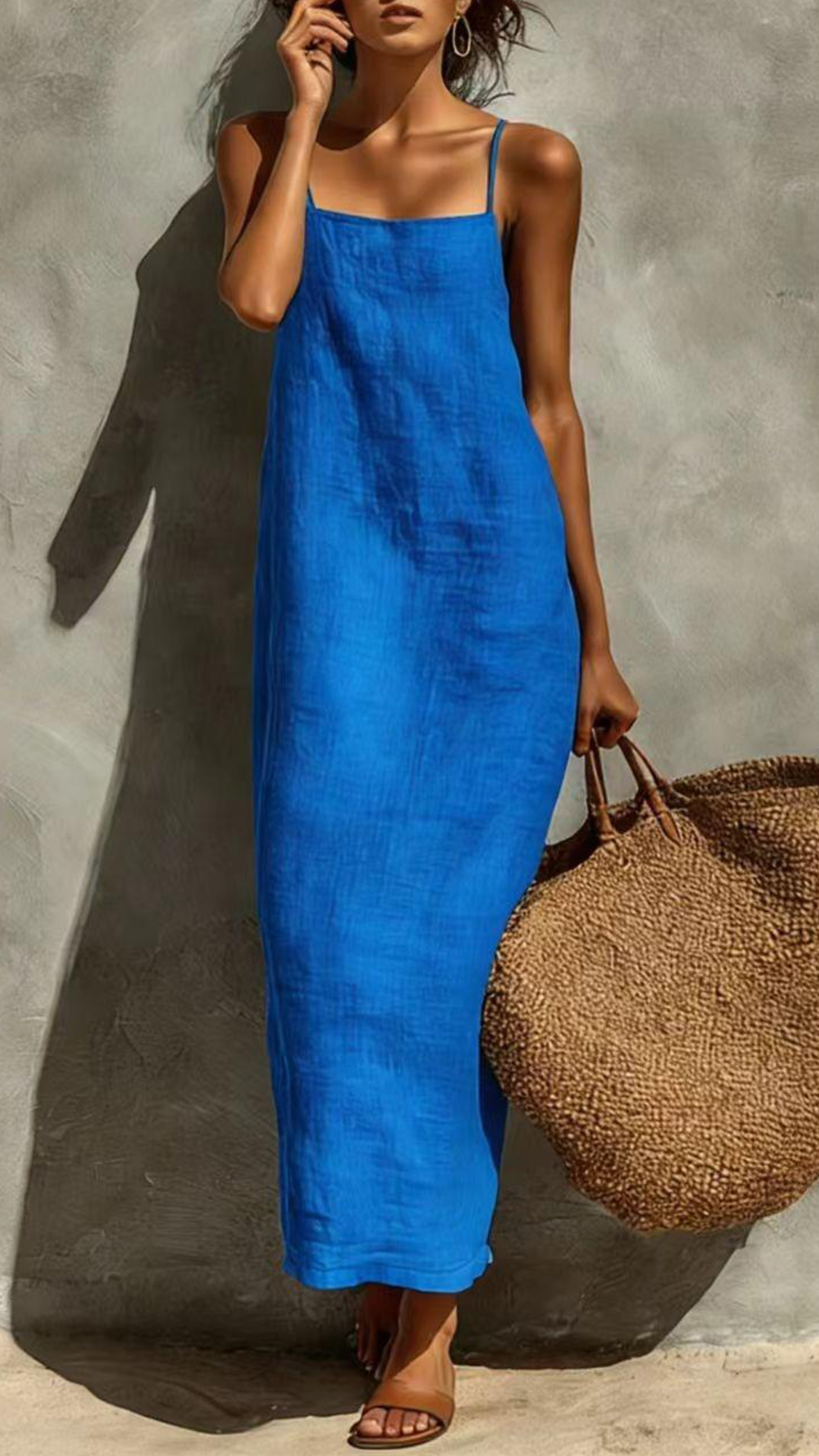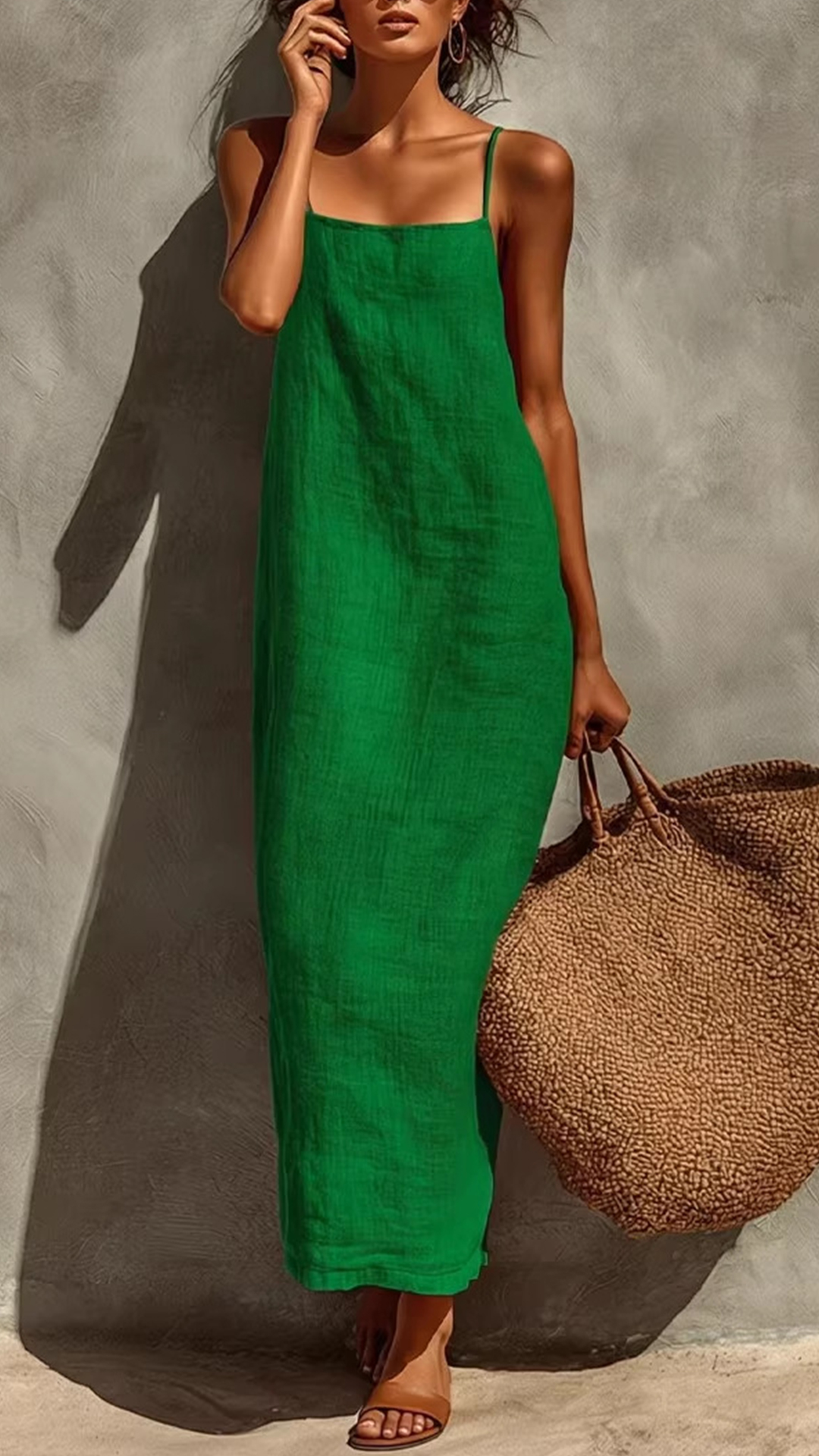 This dress features an exquisite square neck and thin spaghetti straps, paired with a sleek straight maxi silhouette. Crafted from premium linen-feel fabric, its core advantages—natural breathability, skin-friendly moisture absorption, textured drape and body-hugging comfort—are fully embodied in this garment. It maintains a simple and casual silhouette, suitable for various occasions, whether daily commuting, casual social events, vacation getaways or relaxing at home, it can easily create an elegant and relaxed atmosphere.