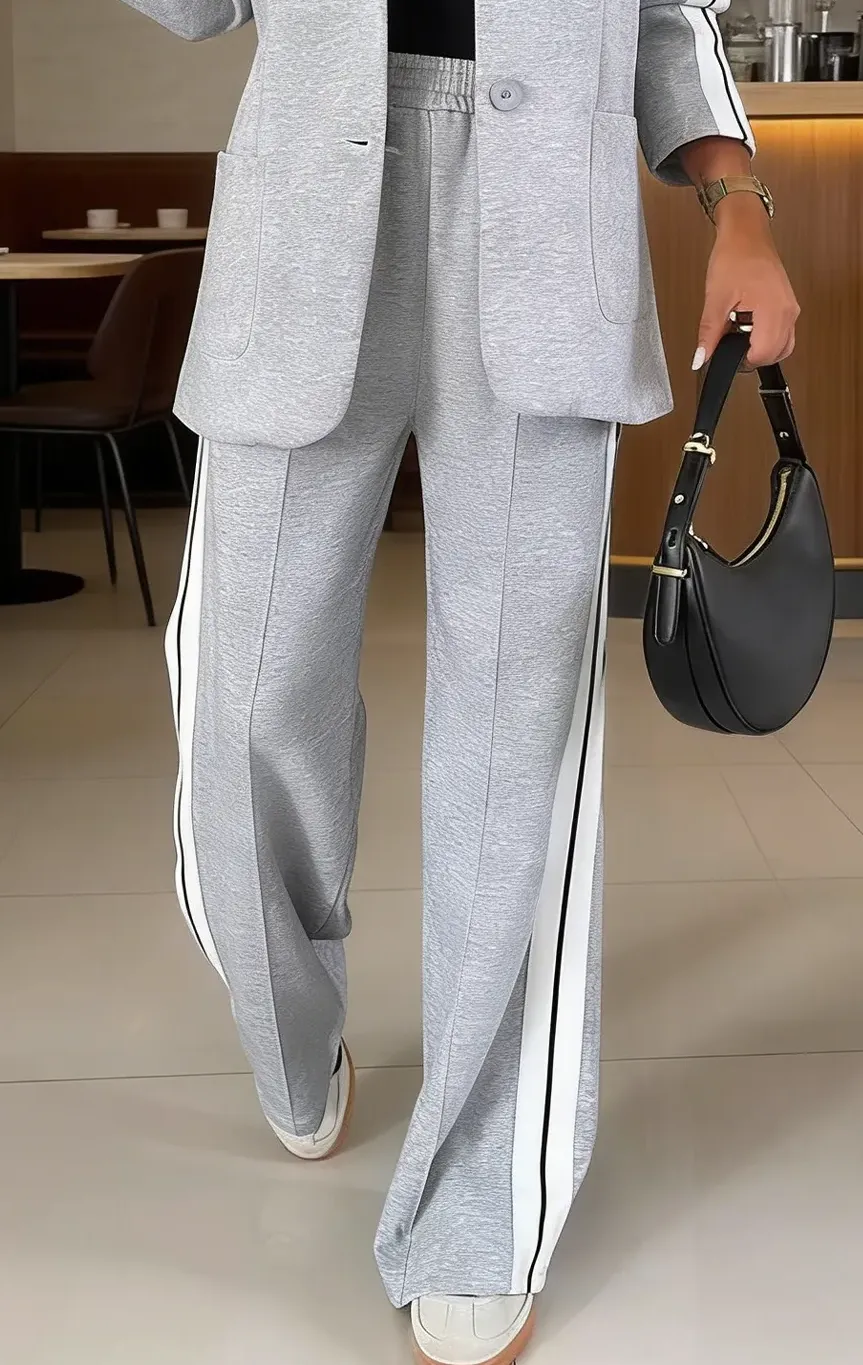 This loosely tailored ensemble features a lapel blazer with sleeves of moderate length, accented by contrasting piping details, paired with matching wide-leg trousers adorned with a vertical stripe pattern. The complete look presents a relaxed silhouette, exuding a casual, laid-back vibe; the trousers are also equipped with pockets. This outfit not only offers a breathable and comfortable wearing experience but also radiates a sleek, smart-casual aesthetic suitable for the workplace. Crafted from breathable, skin-friendly polyester, the fabric boasts a smooth, lightweight texture that feels soft against the skin, ensuring you remain completely unconstrained. With its exceptional drape and sophisticated grey-toned color palette, this set effortlessly adapts to various settings—from commuting to leisure—making it an excellent choice for creating a relaxed yet stylish everyday look.