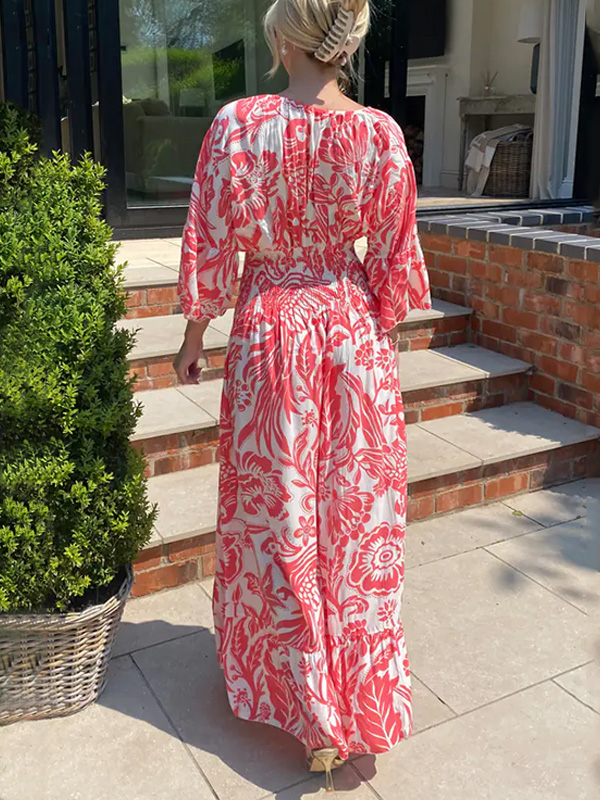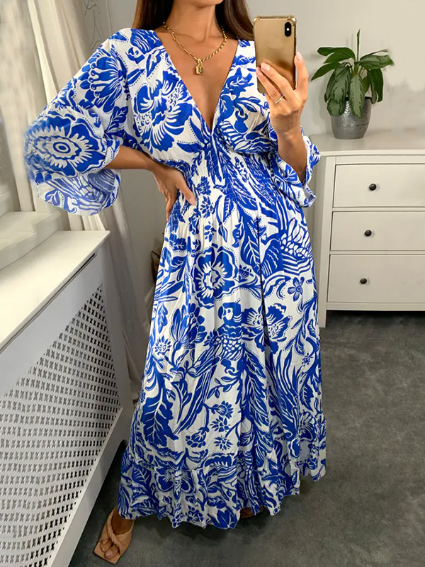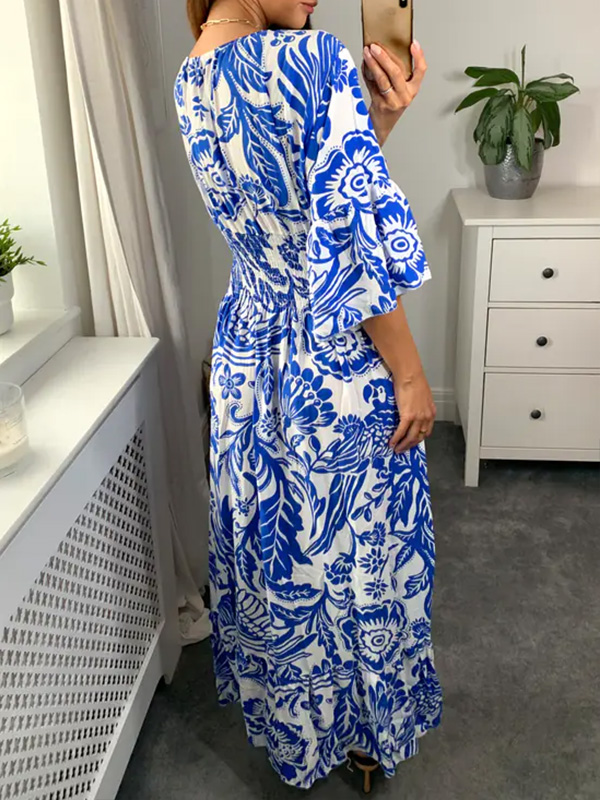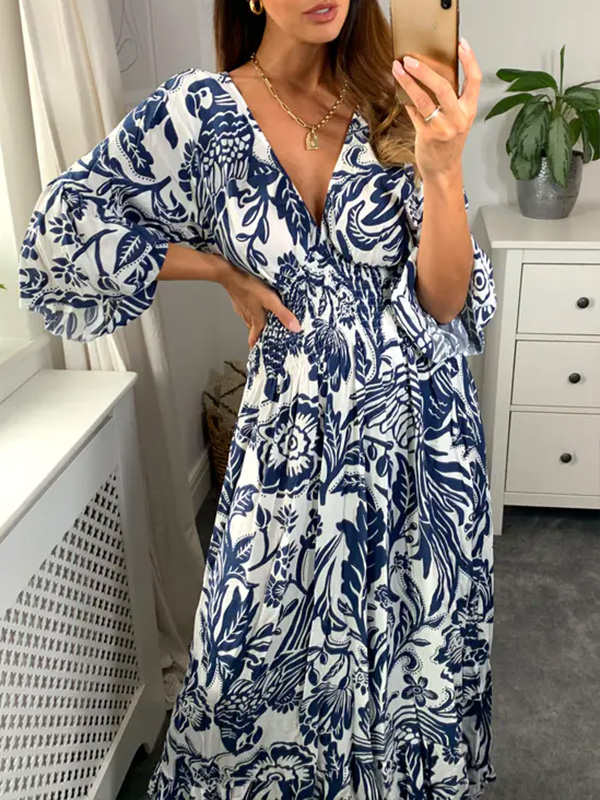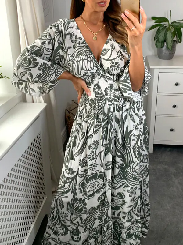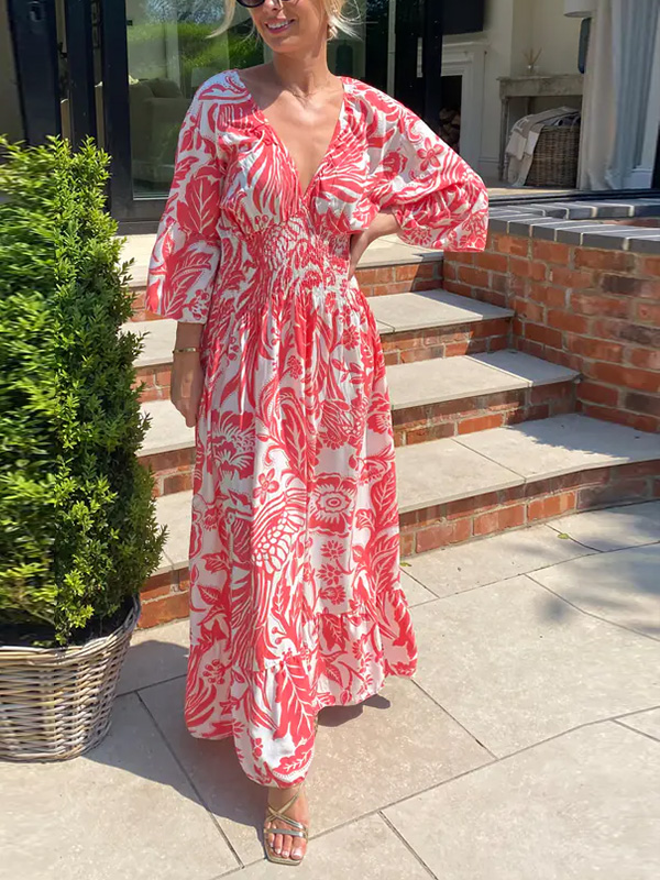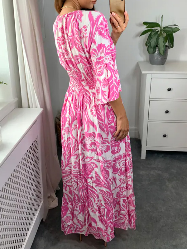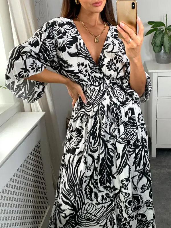 Timeless Elegance: V Neck Elastic Waist Printed Dress