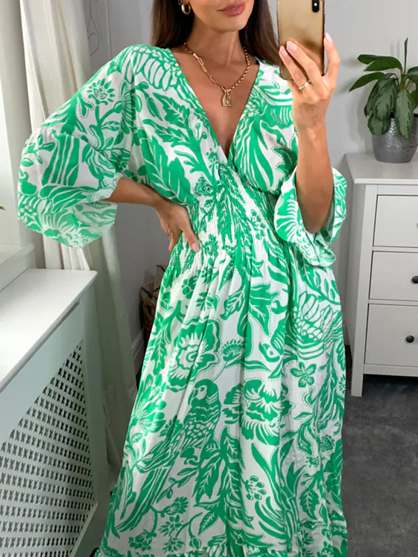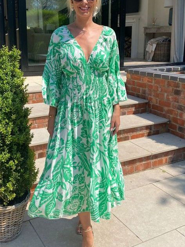 NEW🔥 V Neck Elastic Waist Printed Dress