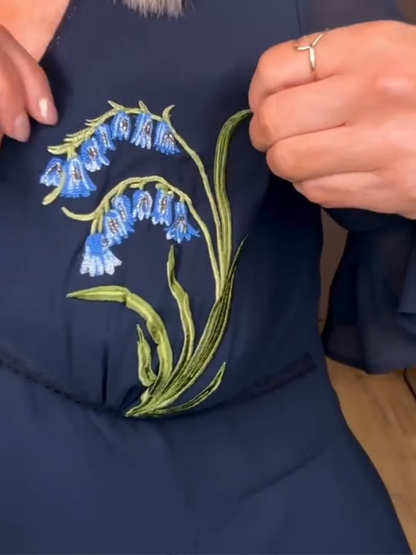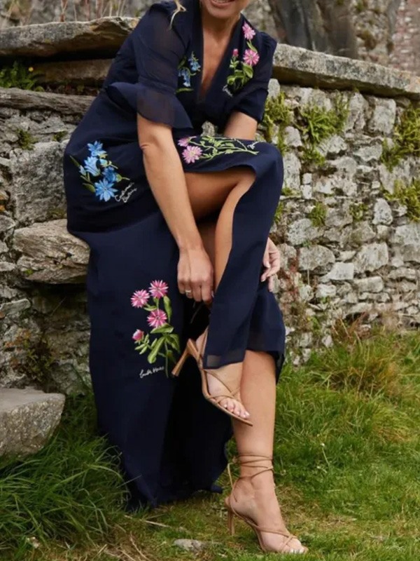 Timeless Elegance: V Neck Floral Embroidered Ruffle Dress