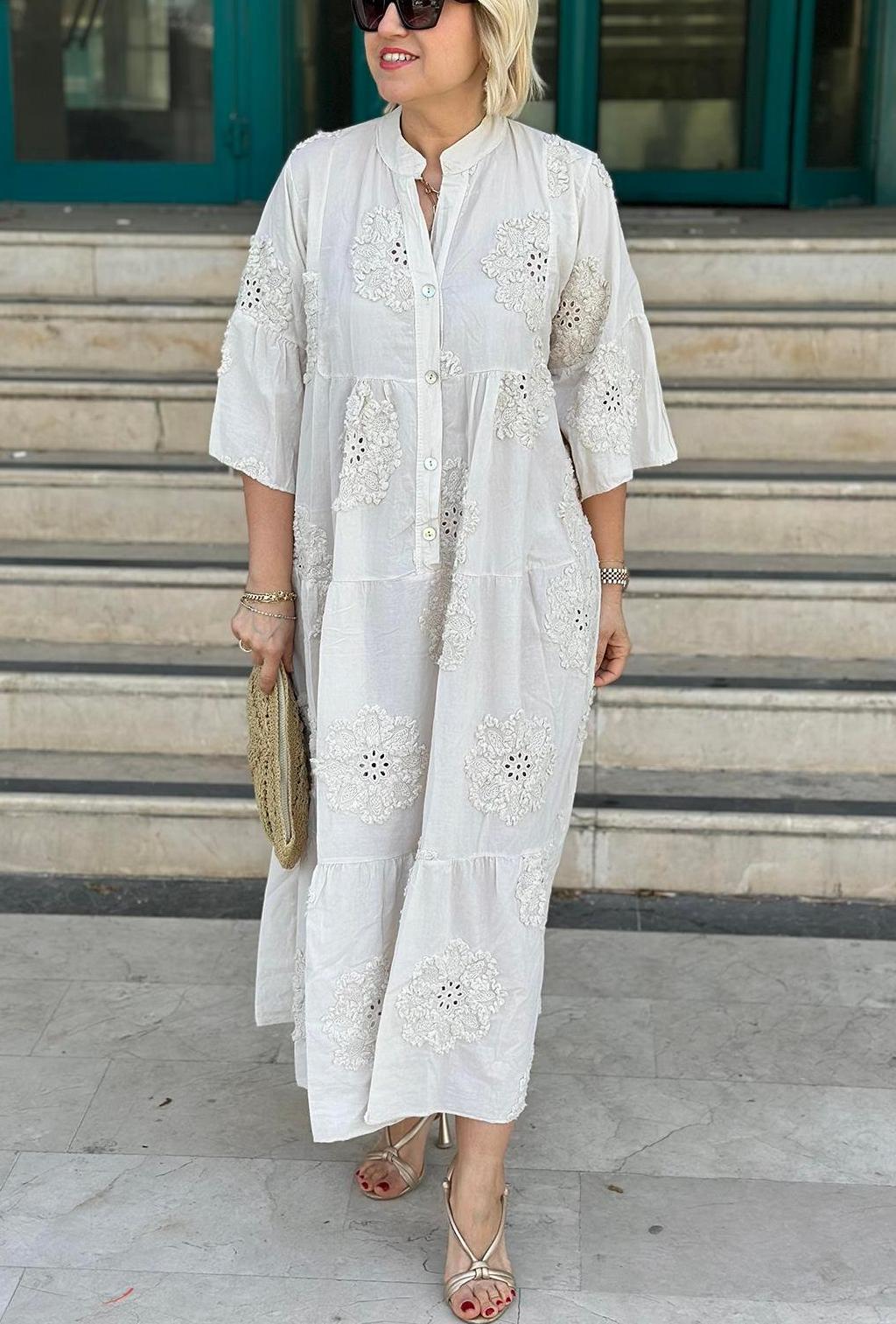 Introducing our Solid color imported embossed scallop cotton dress, designed for the modern woman who values sophistication and style. This dress features a stunning print and elegant maxi length, making it perfect for any occasion.