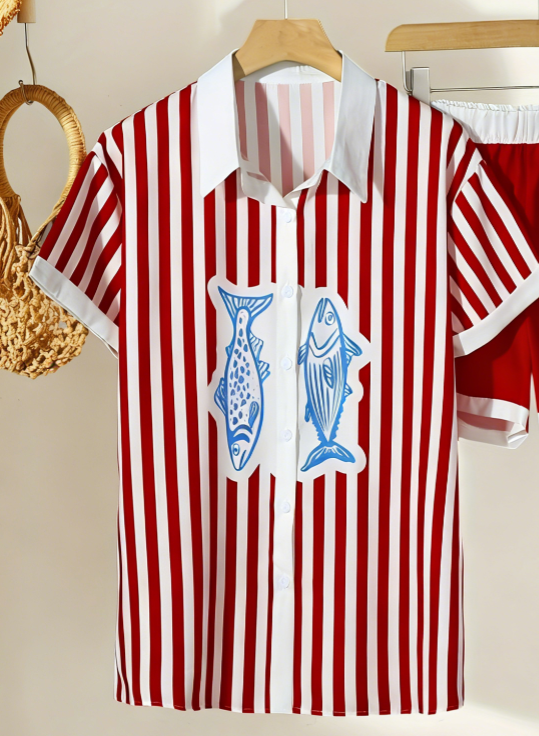 Women's Striped & Color-Block Sardine Print Set — Lapel, Button-Front, Short-Sleeve Top & Shorts