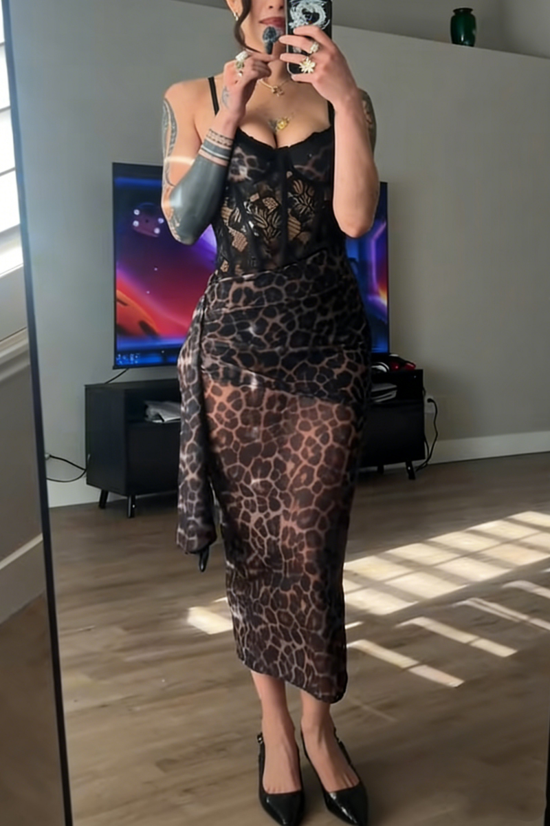 Women's Leopard Print Strapless Sexy Slim Fit Hot Girl Style Spaghetti Strap Long Dress