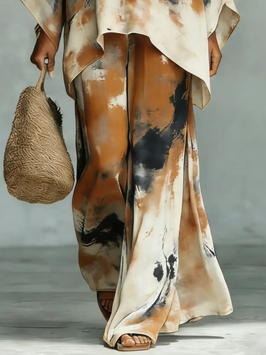 Featuring a loose-fit top paired with flowy wide-leg pants, this outfit creates a flattering silhouette while keeping you comfortable all day. The breathable cotton-linen fabric makes it a perfect choice for warm weather and relaxed occasions.